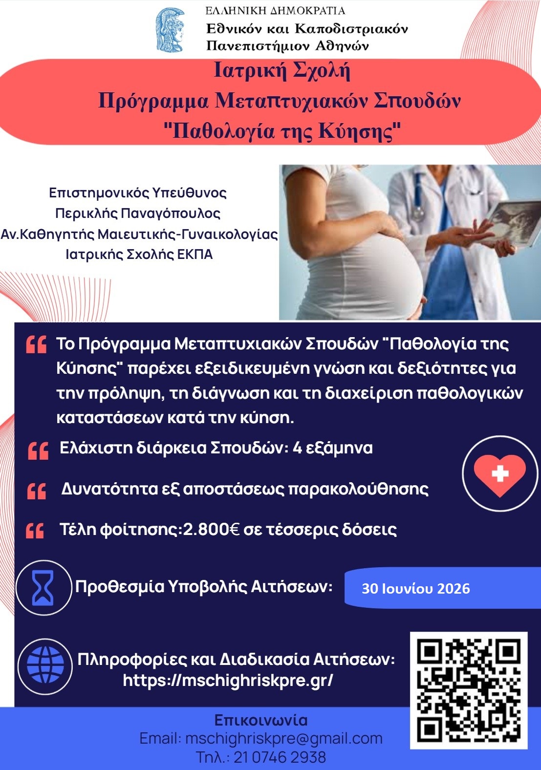 Το Πρόγραμμα Μεταπτυχιακών Σπουδών (ΠΜΣ) με τίτλο «Παθολογία της Κύησης» της Ιατρικής Σχολής του Εθνικού και Καποδιστριακού Πανεπιστημίου Αθηνών προσφέρει ένα ολοκληρωμένο και σύγχρονο πλαίσιο εκπαίδευσης. Εστιάζει στις φυσιολογικές και παθοφυσιολογικές μεταβολές κατά την εγκυμοσύνη, ενώ παρέχει εξειδικευμένες γνώσεις για τη διάγνωση και διαχείριση επιπλοκών υψηλού κινδύνου, όπως ο πρόωρος τοκετός, η προεκλαμψία, ο διαβήτης κύησης, οι υπολειπόμενες ενδομήτριες αναπτύξεις, οι αποβολές επαναλαμβανόμενου χαρακτήρα και άλλες σοβαρές καταστάσεις.
